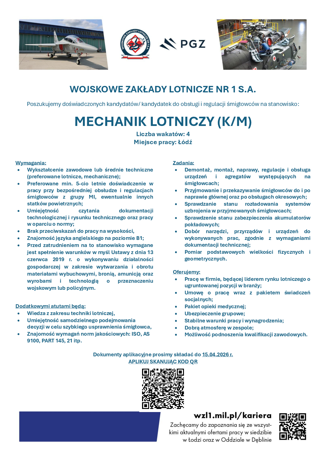 /wp-content/uploads/2021/02/logotypy2021.png00Jakub Gałka/wp-content/uploads/2021/02/logotypy2021.pngJakub Gałka2026-04-03 14:47:142026-04-03 14:47:14WOJSKOWE ZAKŁADY LOTNICZE NR 1 S.A. Poszukujemy doświadczonych kandydatów/ kandydatek do obsługi i regulacji śmigłowców na stanowisko: MECHANIK LOTNICZY (K/M) Liczba wakatów: 4 Miejsce pracy: Łódź