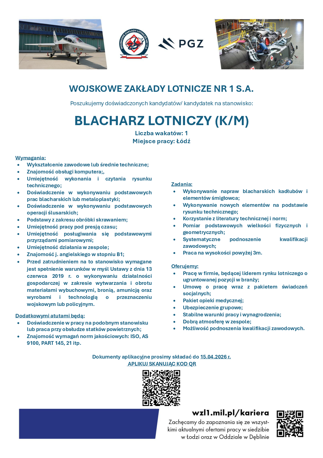 WOJSKOWE ZAKŁADY LOTNICZE NR 1 S.A. Poszukujemy doświadczonych kandydatów/ kandydatek na stanowisko: BLACHARZ LOTNICZY (K/M) Liczba wakatów: 1 Miejsce pracy: Łódź