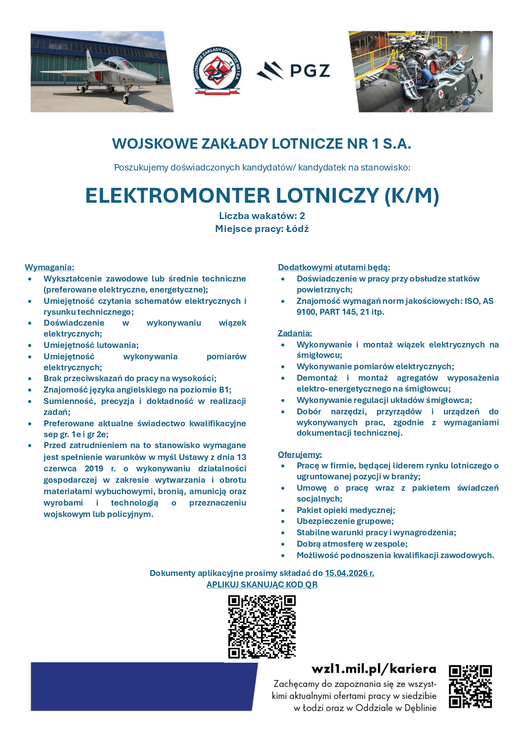 WOJSKOWE ZAKŁADY LOTNICZE NR 1 S.A. Poszukujemy doświadczonych kandydatów/ kandydatek na stanowisko: ELEKTROMONTER LOTNICZY (K/M) Liczba wakatów: 2 Miejsce pracy: Łódź