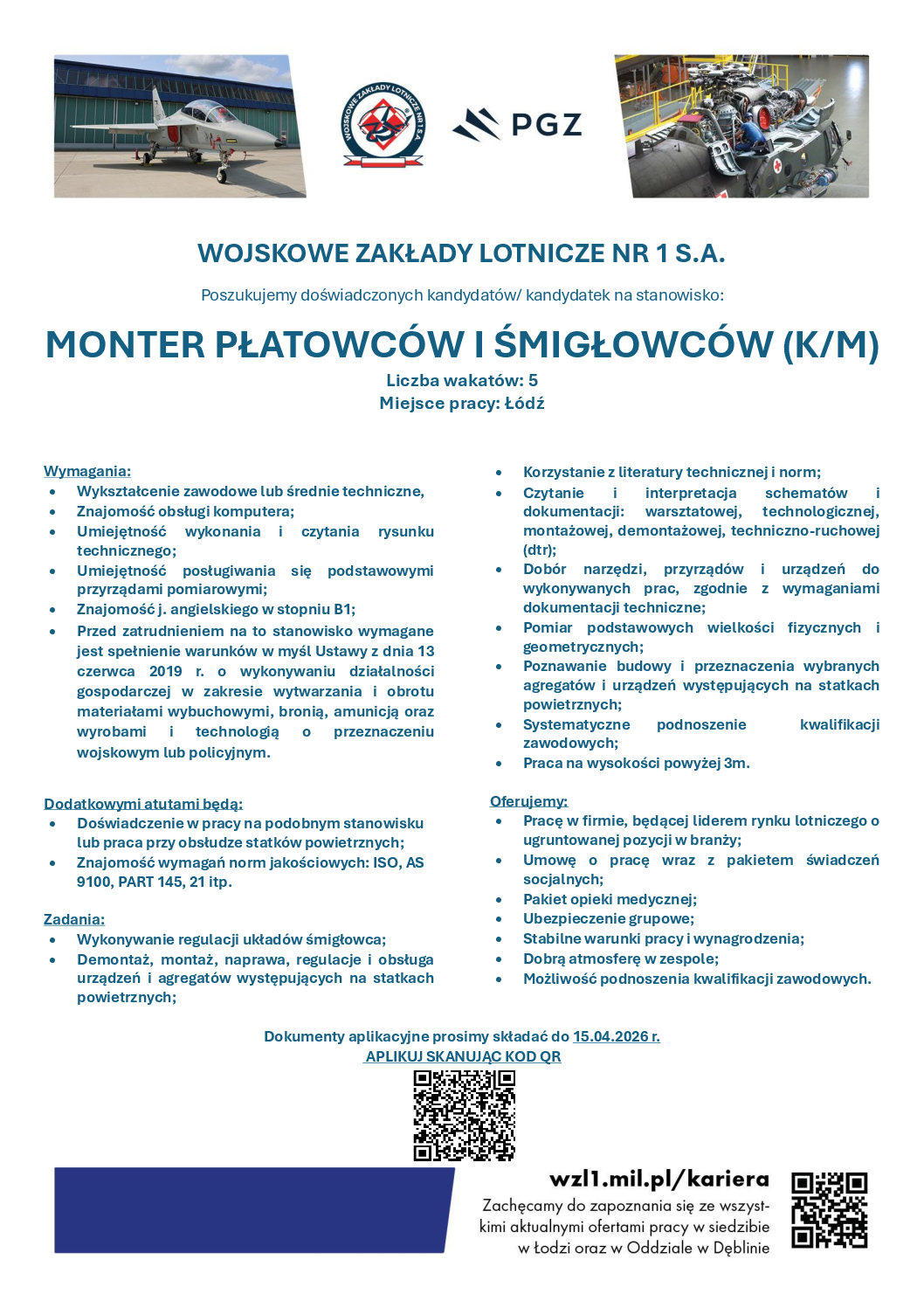 /wp-content/uploads/2021/02/logotypy2021.png00Jakub Gałka/wp-content/uploads/2021/02/logotypy2021.pngJakub Gałka2026-04-03 14:45:352026-04-03 14:45:35WOJSKOWE ZAKŁADY LOTNICZE NR 1 S.A. Poszukujemy doświadczonych kandydatów/ kandydatek na stanowisko: MONTER PŁATOWCÓW I ŚMIGŁOWCÓW (K/M) Liczba wakatów: 5 Miejsce pracy: Łódź
