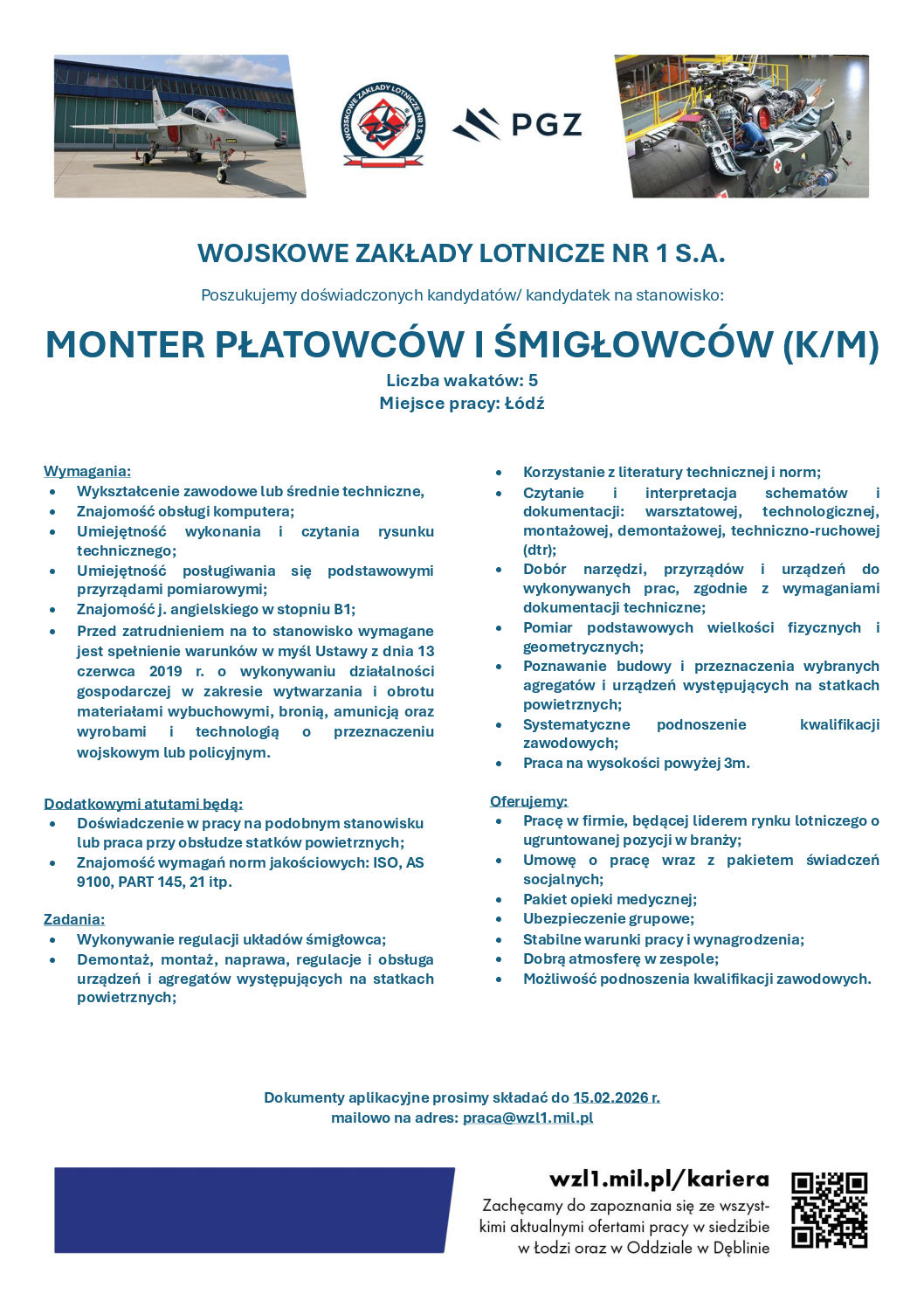 WOJSKOWE ZAKŁADY LOTNICZE NR 1 S.A. Poszukujemy doświadczonych kandydatów/ kandydatek na stanowisko: MONTER PŁATOWCÓW I ŚMIGŁOWCÓW (K/M) Liczba wakatów: 5 Miejsce pracy: Łódź