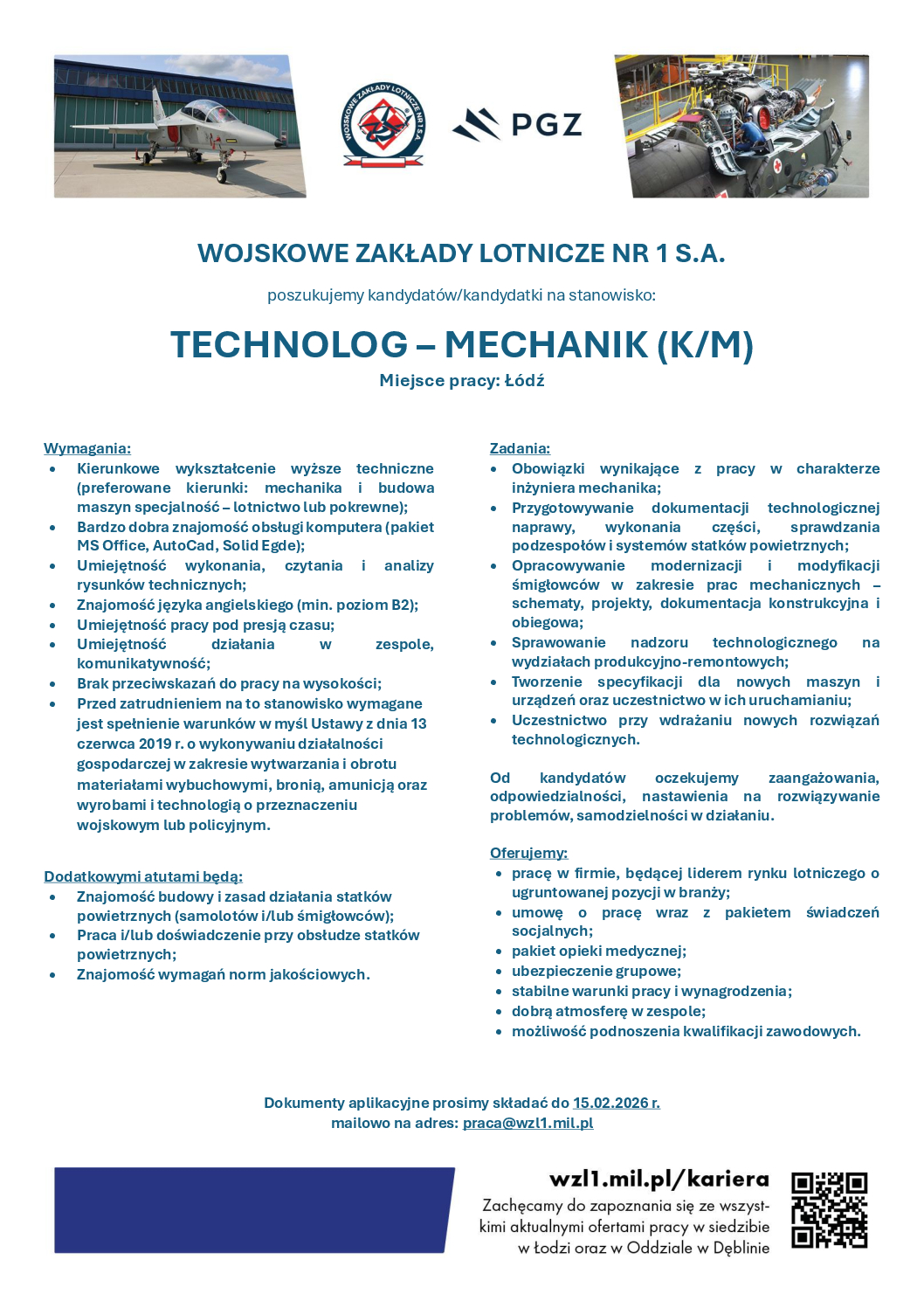 WOJSKOWE ZAKŁADY LOTNICZE NR 1 S.A. poszukujemy kandydatów/kandydatki na stanowisko: TECHNOLOG – MECHANIK (K/M) Miejsce pracy: Łódź