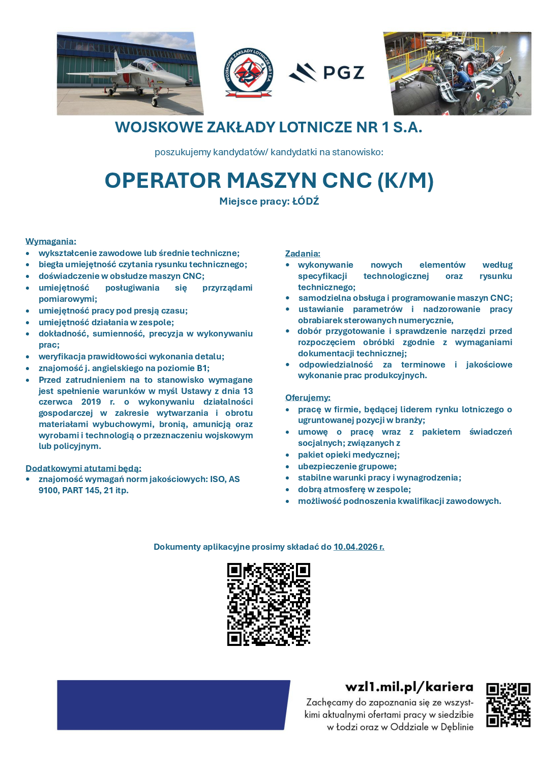 WOJSKOWE ZAKŁADY LOTNICZE NR 1 S.A. poszukujemy kandydatów/ kandydatki na stanowisko: OPERATOR MASZYN CNC (K/M) Miejsce pracy: ŁÓDŹ