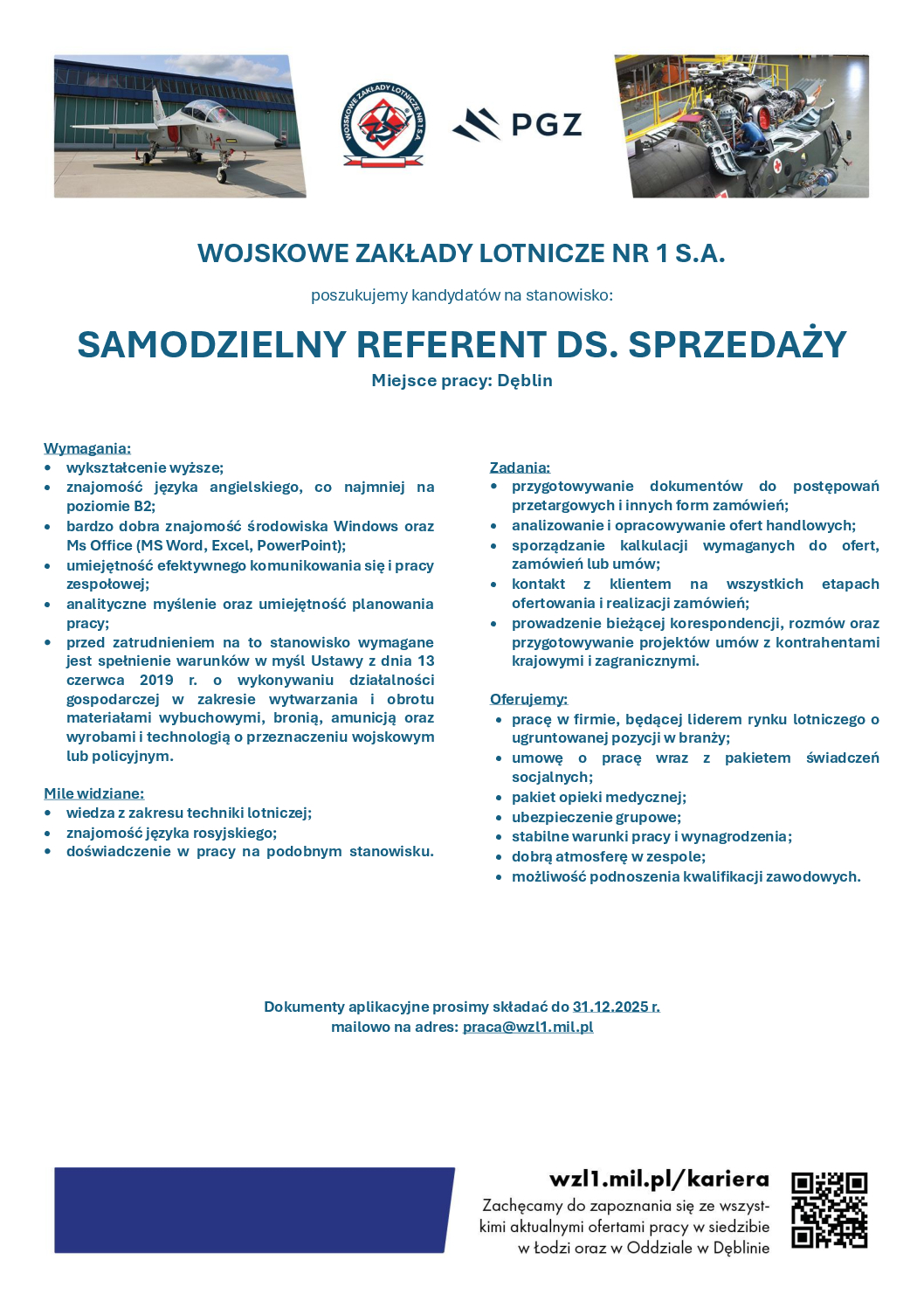 WOJSKOWE ZAKŁADY LOTNICZE NR 1 S.A. poszukujemy kandydatów na stanowisko: SAMODZIELNY REFERENT DS. SPRZEDAŻY Miejsce pracy: Dęblin