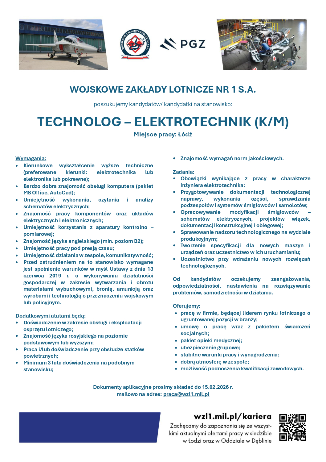 WOJSKOWE ZAKŁADY LOTNICZE NR 1 S.A. poszukujemy kandydatów/ kandydatki na stanowisko: TECHNOLOG – ELEKTROTECHNIK (K/M) Miejsce pracy: Łódź