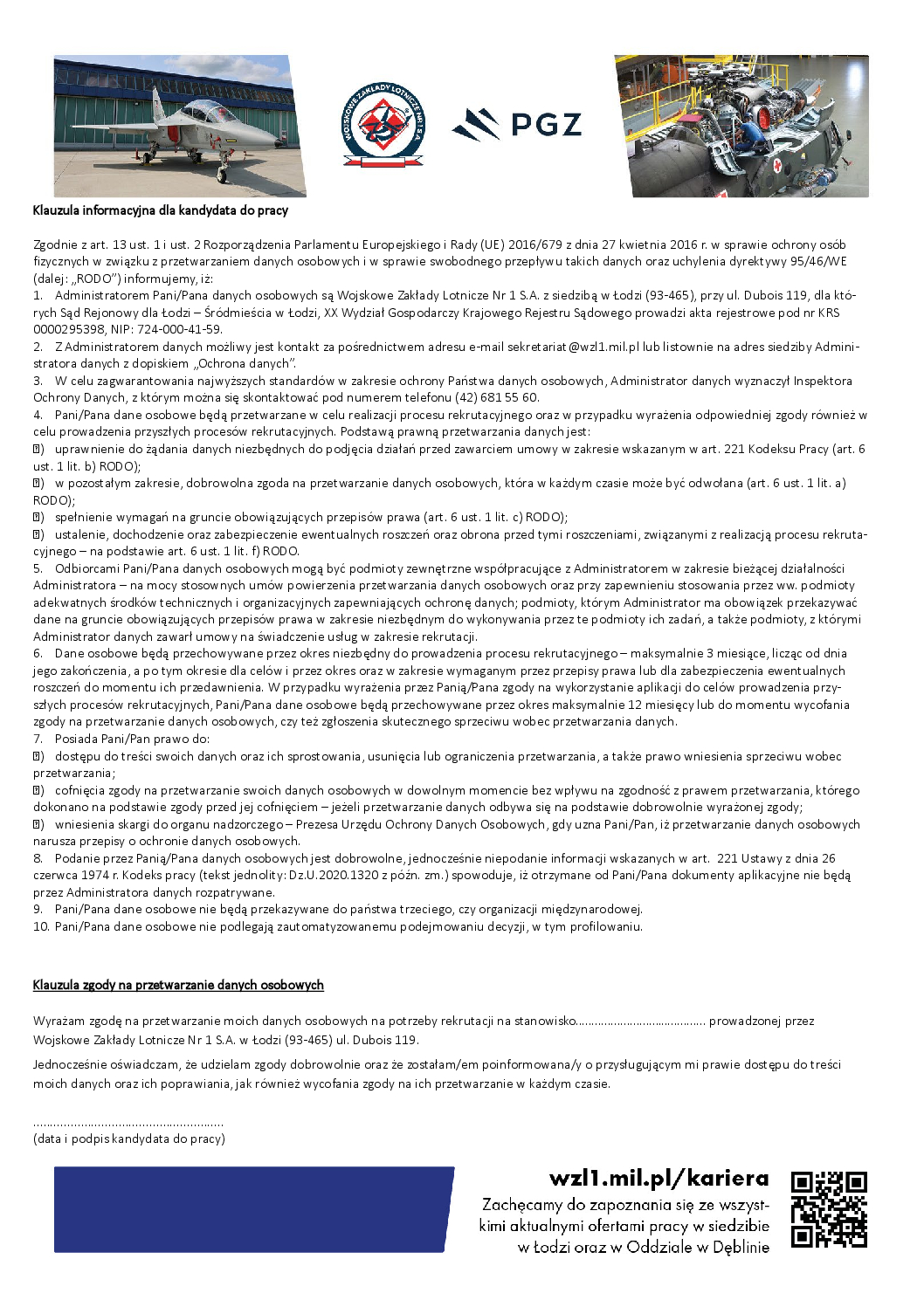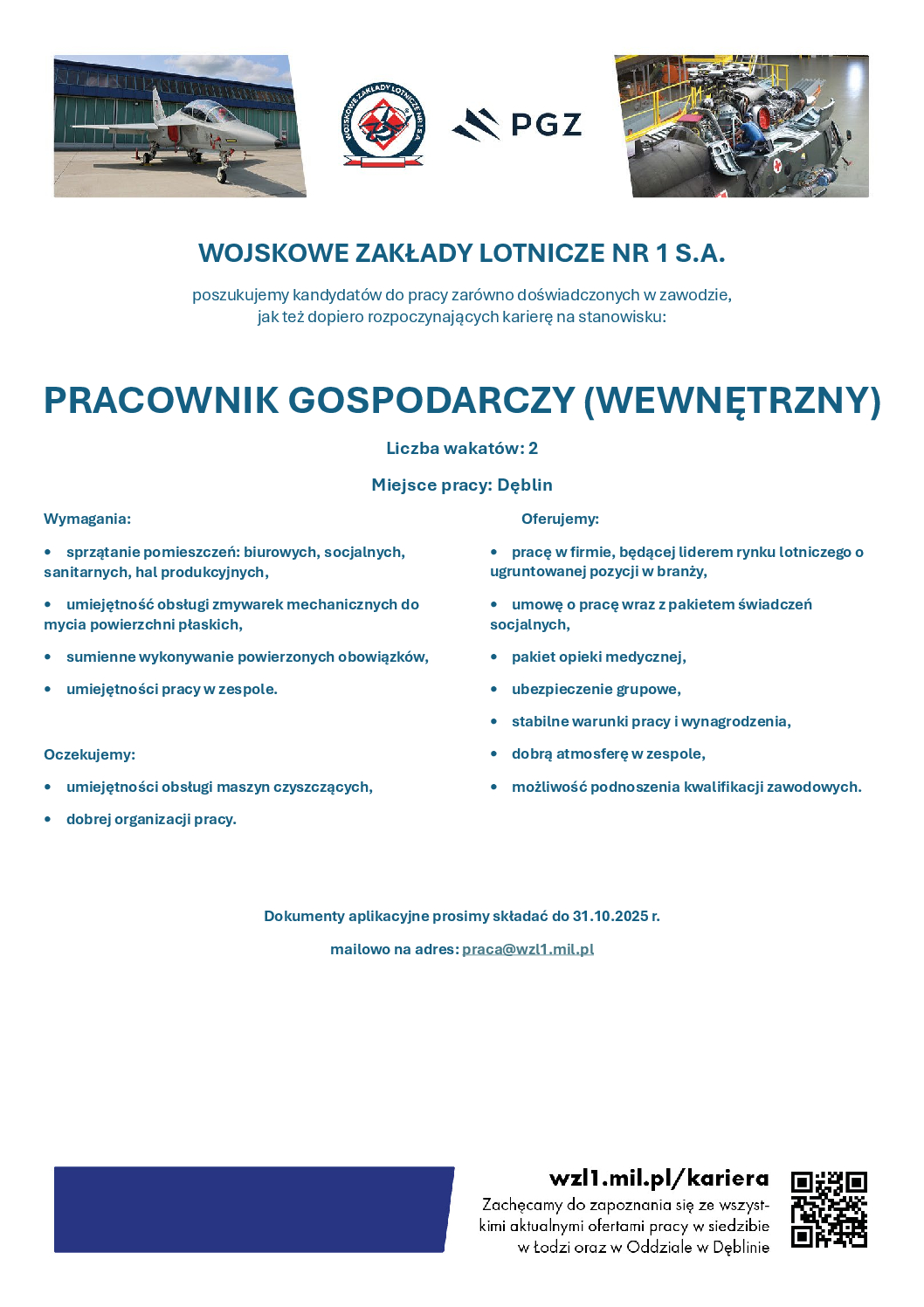 WOJSKOWE ZAKŁADY LOTNICZE NR 1 S.A. W ŁODZI poszukuje kandydatów na stanowisko:... WOJSKOWE ZAKŁADY LOTNICZE NR 1 S.A. W ŁODZI poszukuje kandydatów doświadczonych...